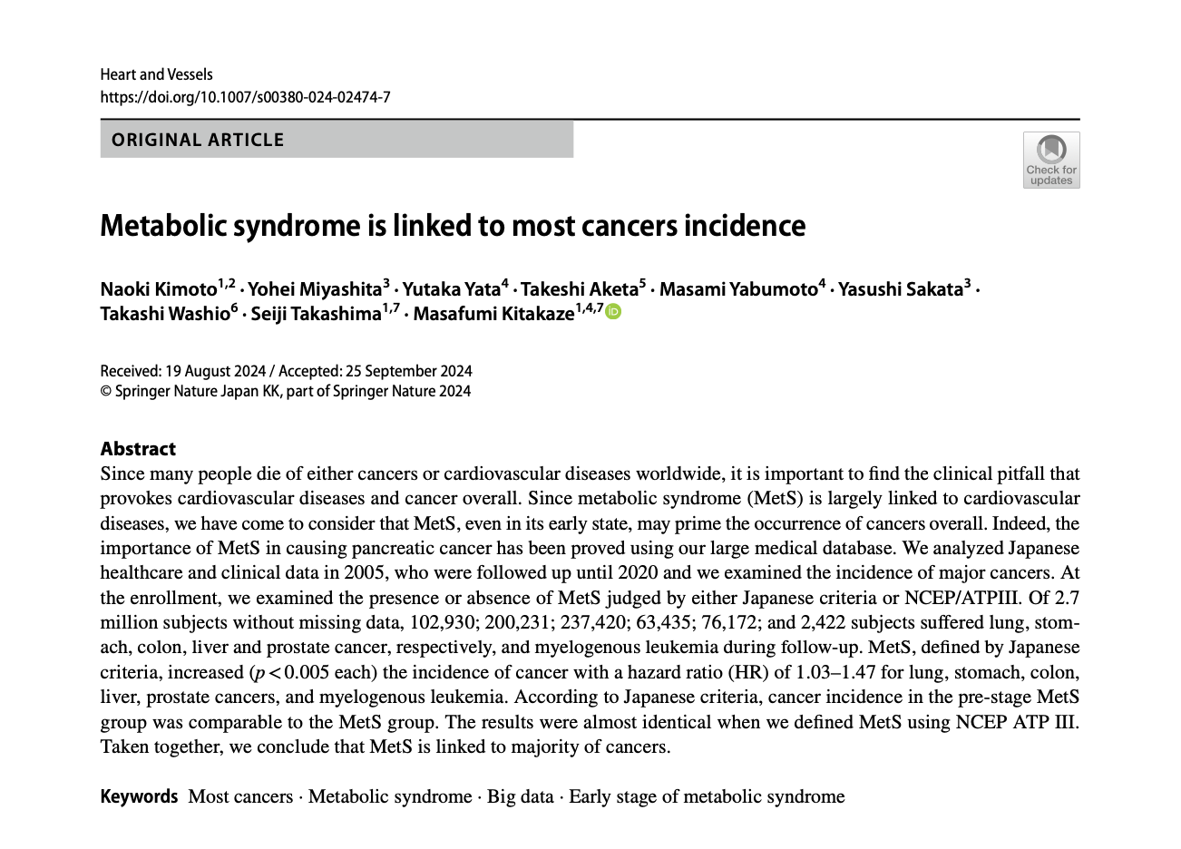 医師 北風政史先生と、弊社 明田健史が共同著者として参画した論文「メタボリック症候群とがんとの関係に関する臨床研究」がHeart & Vessels誌に掲載されました。
